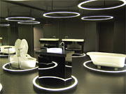 箱型になった照明を落とした空間に浮かび上がるのは、LEDによる円形の照明。同シリーズ新作の「目玉」(同社)で、クリスタル素材の「輪」がLEDで光る洗面カウンター「ルナクリスタル」と同じクリスタルを天井や床に配置。大型見本市ミラノ・サローネでも「好評を得た」(同)という、パリを拠点に活動する著名デザイナー集団「エリウムステュディオ」が手掛けたシャワー金具など、無駄をそぎ落とした美しい製品が並ぶ。