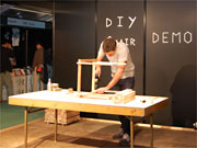 会場内のブースを自身のアトリエに見立て、黙々と作業を進めるのは、ロンドンを拠点に活躍するデザイナー、マックス・ラムさん。今回日本に初上陸した「マテリアル&ディテール」部門で、実際に「素材」(木)を組み立てる作業を実践している。インテリアへと形を変えていく素材の完成形を間近で見ることができるユニークな試み。
