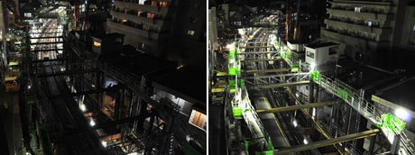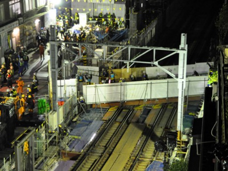 *1時、最終の下り回送電車を見送った後、工事作業員が一斉に動き出し地下化切替工事が始まる。代官山駅ホームでは仮設ホームの撤去と既存の地上線の降下のため、多くの工事作業員が線路内に降りて作業を進める。
