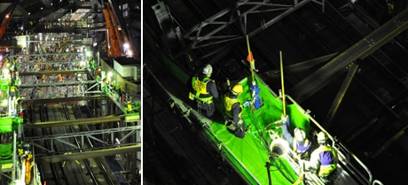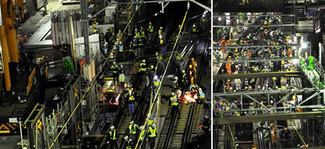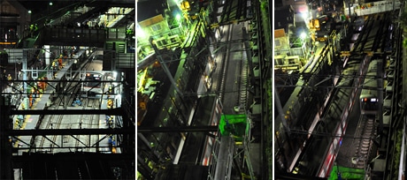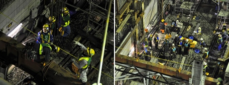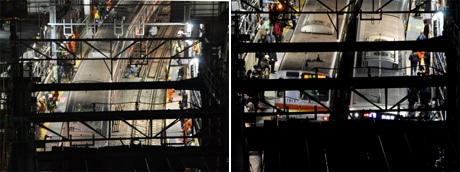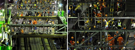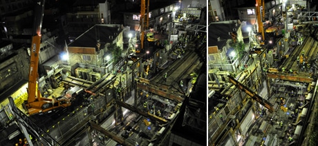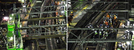 *0時過ぎ、工事現場一斉に照明が点灯され、273メートル区間が暗夜に浮かび上がる。営業線が運行する中で既に大型クレーン車7台が各配置にスタンバイし、工事作業員も本格的な工事始動に向けて準備を進める。