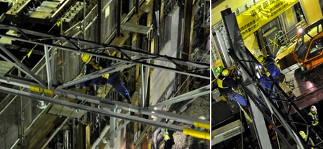 *2時58分、架線柱に上り、従来地上線の架線を外す作業に取り掛かる。