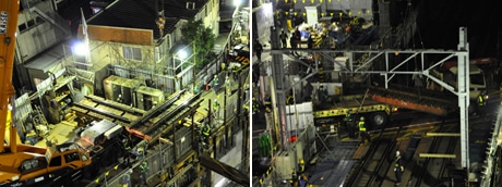 *2時25分、ジャッキを用いて既存の地上線を持ち上げる「扛上」が進められる。渋谷第一号踏切と代官山駅ホームの中間付近は線路沿いに住宅が密集し、クレーン車を設置することが困難な場所であることから「撤去」ではなく「扛上区間」となっている。