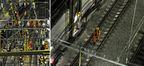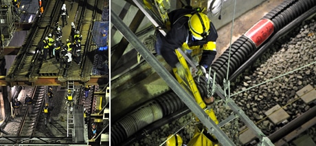 *4時、架線を新しい地下線へ下げてつなげる作業が進められる。