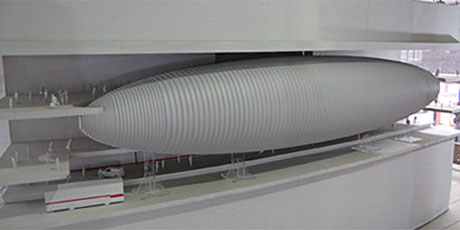 「地宙船」(写真=模型)はラグビーボール状。「人の心に残る駅」を目指す