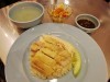 「カオ(=ご飯)マン(=油)ガイ(=鶏肉)」は鶏肉をゆでただしスープで炊いたご飯に、ゆでた鶏肉とソースをかける料理。タイ本店は1960年にタイ・プラトゥーナムで創業し、今年54年目を迎える老舗。従業員がピンクのユニホームを着ていることから、「ピンクのカオマンガイ屋」の名で知られている。