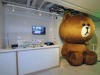 店舗面積は、地下1階=57平方メートル、1階約=98平方メートル。ガラス張りのファサード上部には、クマの「ブラウン」やウサギの「コニー」、カエルの「レナード」などのキャラクターをデザインしたサインを掲出。白を基調に「ポップな雰囲気」に仕上げた1階には、エントランス入ってすぐや店舗奥などにはキャラクターのオブジェを設置。中でも、レジ横のブラウンは高さ約3メートルほどあり左耳が天井に触れているほどの大きさ。地階は木目の床など落ち着いた雰囲気で、フロアで異なるデザインになっている。