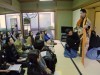楽屋では、恨みや嫉妬を持った女性「般若」などの面(おもて)や、顔の角度で表情を変える表現方法、若い女性を演じる場合は胸元を開けたり曲線を出したりするなど、役によって変える装束の着付け方を紹介。謡のけいこ体験では、「羽衣」の一節を全員で練習し、楽師は面を着けて舞うため「なるべく大きな声を出す」ことなどをアドバイスした。