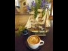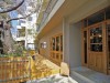 店頭に植えられている樹齢約50年の桜の木が目印。店舗面積は約20坪。店内23席のほかテラス席も用意。住居だった空間を自分たちで半年かけて改装した店舗は木目を基調に仕上げた。客同士も交流できる空間を目指した店内中央に置く8人掛けのテーブルは、1920年〜30年代にアメリカの船内で使われていたもので椅子も一体になっている。店内には松島さんが集めてきたオブジェなどを飾り、1970年代のブラックミュージック、ジャズなどをレコードで流している。エントランス近くにはギャラリーを設け、今後ワークショップなども予定している。