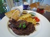 オープン時は18地域の朝食を用意する。ハードタイプのNYベーグルやスクランブルエッグなどの「マンハッタン」(1,500円)、独自のバーベキューソースで「チミチュリソース」を添えた300グラムの牛ステーキやスリッパという意味のイタリアパン「チャパタ」などの「アルゼンチン」(3,200円)、マフィンの上に煮ダコ・生ダコをのせてトマトやタプナード(アンチョビーとオリーブ)のソース3種を添える「ポルトガル」(2,000円)など。今後提供する地域は増やしていく予定。