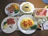 同カフェでは、大賞上位入賞バンドの主要キャラクターなどに着想を得た限定メニューを提供。メニューは、バンド「徒然なる操り霧幻庵」のドラマー「ダル太夫」をイメージしたミニうどんと煮物をおかずにした弁当(1,490円)、火であぶったマシュマロ「スモア」やメロン・ブルーキュラソームース、マンゴーソースなどでバンド「トライクロニカ」をイメージしたパフェ(1,274円)など。特別メニューとして、作中でシンガンクリムゾンズのメンバーがカレーハウス「NYANYA弐番館」で頼んだ、ウインナーやハンバーグ、納豆、エビフライなどをトッピングするカレー(3,208円)も用意する。