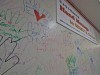 参加するのは82組で、庁舎外と庁舎内2階〜6階を展示会場に使う。広場側の窓には、ローラーアーティストさとうたけしさんが5色のペンキで「COLOR」の文字を浮かび上がらせた。2階の出口手前は自信の手形とメッセージが書き込める「ハンドメッセージ」コーナーで、長谷部健渋谷区長をはじめ来場者たちの手形が日に日に増えている。