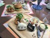 コラボメニューは、猫の顔をイメージした和牛100%パテを使ったハンバーガーか紀州南高梅と牛しぐれ煮入りのおにぎりを選べるプレート(1,814円)や、ホワイトチョコレートをコーティングしたカステラで表現したピスケが交ざっているたこ焼き(518円)、うさぎ型の最中やピスケをイメージした餅などをトッピングする鴨(かも)だしの月見うどん、上にココアクッキーをクランチして敷き詰めたチーズケーキ(以上1,382円)など。