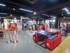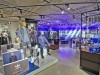 店舗面積は国内最大の300坪。ファサードのデジタルサイネージは5メートル四方に拡張し、エントランスはスタジアムの入場口をイメージ。店内には、陸上のハードル、テニスやバレーボールなどのネット、体育館の床、スコアボードなどスポーツの要素を取り入れた什器を配置。3フロアに用意するフィッティングルームは「ロッカールーム」を模した空間に仕上げている。