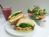 2階がサンドイッチ店。レタスやトマト、アボカド、エビなどの具材にアマニオイルをかける「エビとアボカドのサンド」(880円)など3種類のサンドイッチを中心に、ケールやキヌア、ブロッコリースプラウトなど5種類のスーパーフードを使うサラダ(1,080円、以上11時以降の提供)、赤・黄・緑それぞれ色別の食材で作るスムージー(各580円)などを用意。モーニング(7時〜11時)には、ホットドッグやパニーニ(以上650円)も提供する。客単価は1,000円前後。