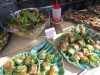 ビュッフェは、アーモンドとドライデーツのパンプキンサラダ、スイートチリソースで食べるスモークサーモンと青パパイアの生春巻き、ムール・ホッキ・小柱の貝3種類を使うジェノバ風冷製パスタ、刻みショウガ・しょうゆ・ナンプラーの「ジャンジャンブルソース」をかける揚げ海鮮チヂミ、ズッキーニやナス、枝豆などのグリル野菜など9品。ムール貝やタコなどの鮮魚をスパイスやラムで味付ける南米風魚介マリネ「セビーチェ」、焼きパイナップルとハラペーニョサルサソースを添えるシュラスコなど4品は、スタッフがテーブルに運ぶスタイルで提供する。