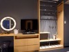 クローゼットにはあえて扉を付けず「見せる収納」にすることで購入品などを飾れるようにし、ハンガーや小物入れも同室に合わせたデザインを採用。ドレッサーの鏡は縁にLEDが付いた「女優ミラー」にし、美顔器(スチーマーナノケア)も設置している。ケーブル無しで音楽を聴けるガラス製のiPhoneスピーカーを置き、ミニバーも備える。