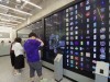 ガラス張りの1階はグレーやシルバーを基調に「近未来的な売り場」に仕上げた。55インチのディスプレーを24枚組み合わせた大型タッチディスプレーが特徴で、商品紹介から購入まで対応。利用には同店専用のアプリが必要で、スマートフォンの画面上にアプリのQRコードを表示してコードリーダー(6台)にかざしてログインすると、ディスプレーに商品が表示される。購入したい商品を選んだ後、スマートフォンを持ち上げると買い物が終了。同様のサービスを提供するiPad3台も用意する。レジに置くコードリーダーにアプリのQRコードをかざすと会計でき、商品は専用のカウンターで受け取る。