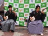 小雨が降る中、来街者でにぎわうバスケ通りには両チームのファンが集まったほか、来街者たちは2メートルを超える選手たちの姿に驚きの声を上げていた。この日は、津軽三味線デュオ「桃響futari」、早稲田大学三味線愛好会「三津巴」の演奏なども行われた。