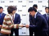 同社の社員数十人に出迎えられる中スーツ姿で登場した選手たち。選手1人ひとりと名刺交換した同社会長の南場(なんば)智子さんは「頑張ろうね」などの声を掛けて歓迎した。南場さんが「手に汗をかいている子が多かった」と話すように緊張の面持ちの選手も多く、初めての名刺交換となった東選手も「控室で(スマートフォンで)作法を調べた。緊張したが自分にとってはちゃんとできた」と安どの表情で振り返った。