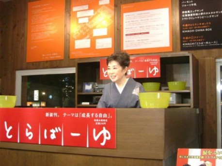「仕事カフェ とらばーゆ」に女優の森光子さんが一番客で来店。「時間ですよ」以来の番台姿に報道陣も集結