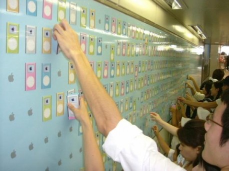 JR渋谷駅構内に貼り出された「iPOD mini」のカラーパネル広告。約400枚のパネルが1分以内で無くなった