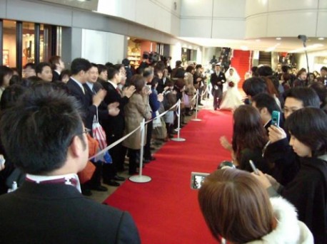 マークシティで行われた「世界一長いバージンロード」企画。スタバ前、手前の新郎が待つ位置が330m地点