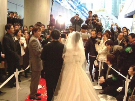 「世界一長いバージンロード」イベントで、挙式を終え報道陣らに取り囲まれる新郎新婦。道玄坂側入口付近で