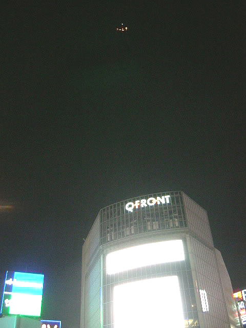 19日、gooが渋谷上空で日本初の「ナイトビジョン」イベント。同時に流れたQFRONTのビジョンを使った告知画面(上)と、実際に肉眼で見えた距離感(別ウィンドウ)