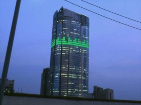 六本木ヒルズ森タワーで300台の照明を使った巨大イコライザーが登場。J-WAVEの同ビル移転を記念して