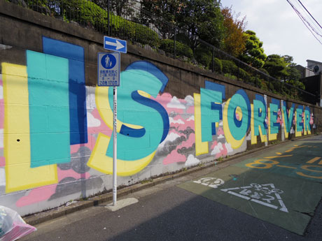 裏原に米スティーブン・パワーズさんのストリートアート。ブロック塀には「NOW IS FOREVER」の文字を描いた