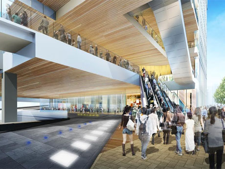 渋谷駅西口の再開発事業本格始動へ。1階バスターミナルと縦導線「アーバン・コア」のイメージ(北東からのぞむ)