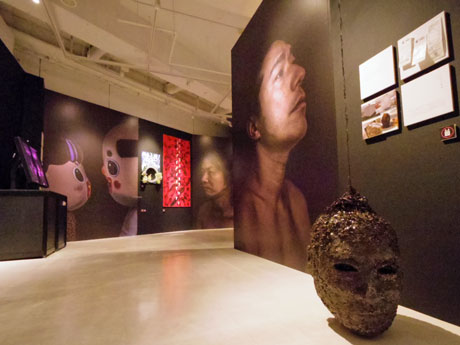 渋谷パルコで「1万円アート−歪(ゆが)んだ大人展−」。カセットテープを大量に使ったトータス松本さんは「頭出し」(写真右手)など