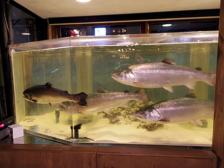 <h2><strong><a href="http://www.shibukei.com/headline/10333/">恵比寿にサケ料理主力の魚介ビストロ。</a></strong>店頭に置くサケが泳ぐ水槽</h2>
