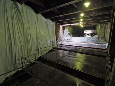 <h2>渋谷駅東口地下の雨水貯留施設・渋谷川移設工事現場、公開−現渋谷川から工事中の迂回ルートへの下流側の切り替え予定地点(右奥が稲荷橋方面)</h2>