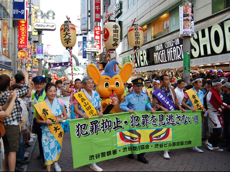 <h2>渋谷センター街を「ねぶた」が運行−写真はピーポくんも加わって行われたパレードの先頭</h2>