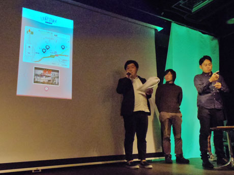 <h2>ヒカリエで「シブヤ散歩会議」初開催。写真=「散歩アプリコンテスト」グランプリ受賞アプリ「サンポイント」のモックアップを紹介するステッチのメンバー</h2>