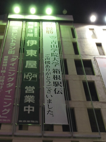 青山学院大学(渋谷区渋谷4)の正門付近に現在、同大陸上競技部の「箱根駅伝」総合優勝を祝い横断幕が掲出されている。