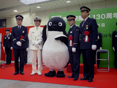 <h2>JR渋谷駅が130周年−写真はSuicaペンギンと記念撮影する4駅長(左から京王電鉄・石川井の頭南管区長、JR東日本・中野渋谷駅長、東京メトロ・石川表参道駅務管区長、東急電鉄・川島渋谷駅長)</h2>