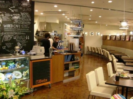 23日、QFRONTの6Fにオープンした「WIRED CAFE」。窓際には無料のインターネットPCも並ぶ。26時まで