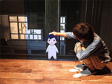 渋谷で「バケモノの子」展。カヤックが手がける「雪と雨の背くらべ」。柱のキズに合わせて手をかざすと、その年齢の雪と雨が現れる。