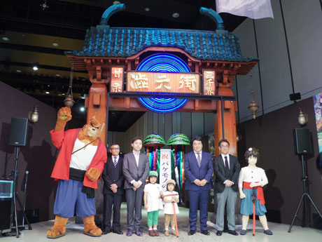 渋谷で「バケモノの子」展。開会セレモニーにプロデューサーの齋藤優一郎さん、「GREEN・DA・KA・RA」のCMキャラクターのグリーンダカラちゃんとムギちゃんらが登場した。