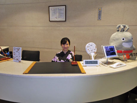 浴衣でクールビズ。受付のスタッフも浴衣姿で来客に対応する