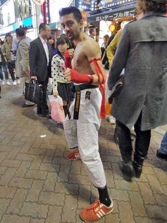 <h2>ハロウィーン前日、渋谷は早くもにぎわい。ゲーム「ストリートファイター」のキャラクター「リュウ」になりきる外国人</h2>