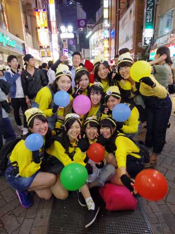 <h2>ハロウィーン前日、渋谷は早くもにぎわい。映画「ミニオンズ」のミニオンたちに仮装したグループ</h2>