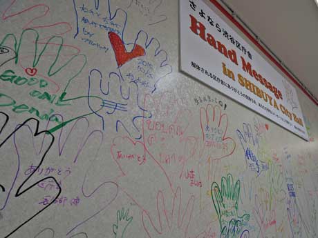 <h2>解体前の旧渋谷区総合庁舎でアート&デザインイベント「シブヤのタマゴ」。長谷部健渋谷区長(左下)をはじめ来場者の手形とメッセージ</h2>