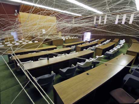 <h2>解体前の旧渋谷区総合庁舎でアート&デザインイベント「シブヤのタマゴ」。毛糸を巡らせた議場</h2>