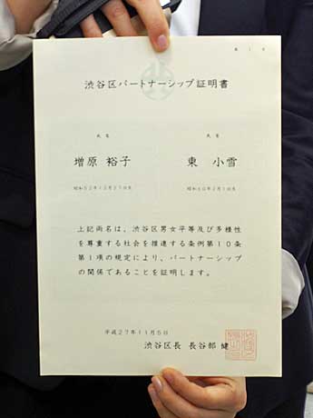 <h2>渋谷区、同性カップルに「パートナーシップ証明書」交付開始。交付された証明書</h2>