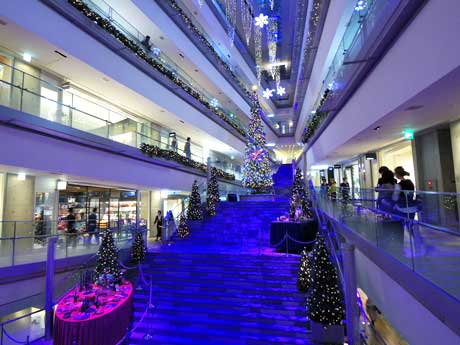 <h2>表参道ヒルズ、高さ8メートルのXマスツリー点灯。青と白の照明に包まれた空間にハープなどの音楽が流れる「夜」の空間演出</h2>