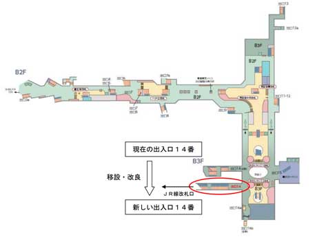 東急線・東京メトロ線とJR線との主要乗り換え経路となっている渋谷駅東口の14番出入り口が2017年夏、乗り換え導線改良のため移設される。