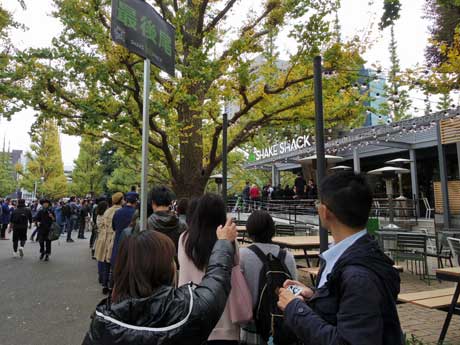 外苑前に11月13日、NY発人気ハンバーガーショップ「Shake Shack(シェイク シャック)」の日本1号店「シェイク シャック外苑いちょう並木店」(港区北青山2、TEL 03-6455-5409)がオープンした。